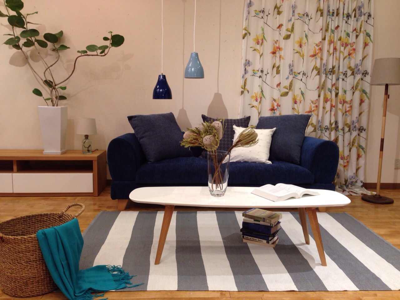 ネイビーのソファを主役にしたコーディネイト。