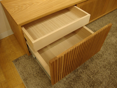 開き扉になり棚を取るとA4サイズのBookも収納ができます。左側は2段引出し