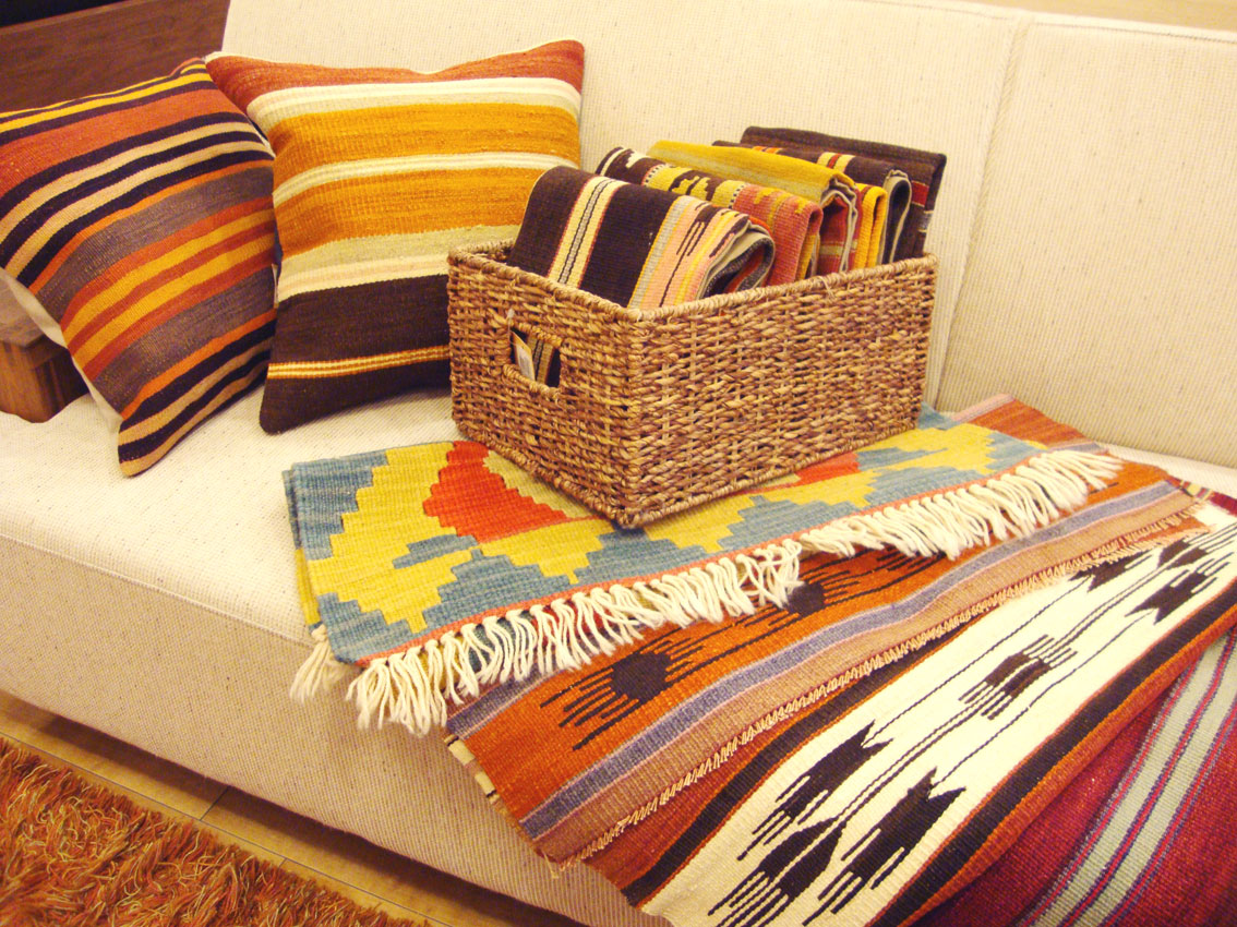 ナチュラルでシンプルなデザインの家具に、キリムを取り入れることで