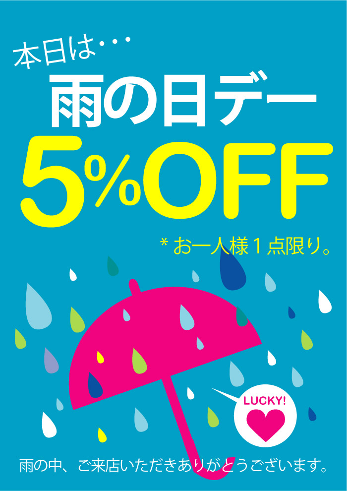 「雨の日にご来店いただくとなんと1商品のみですが・・・5%オフ!!」