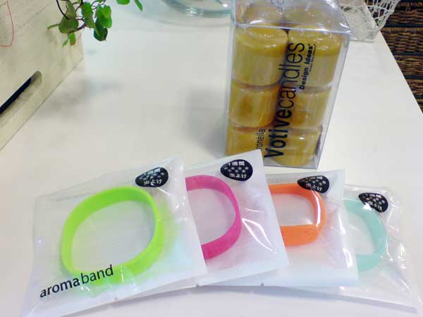右:これからのシーズン、アウトドアにおすすめな虫除けアロマバンド。