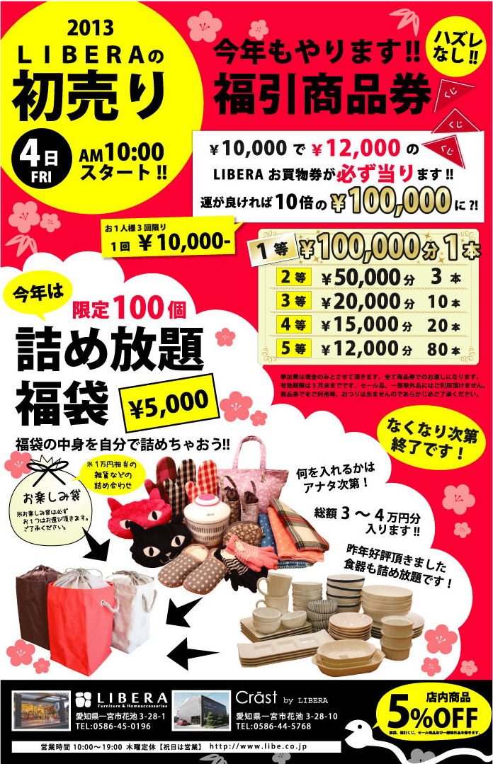 リベラでは2013年1月4日(金)より、初売りとしまして