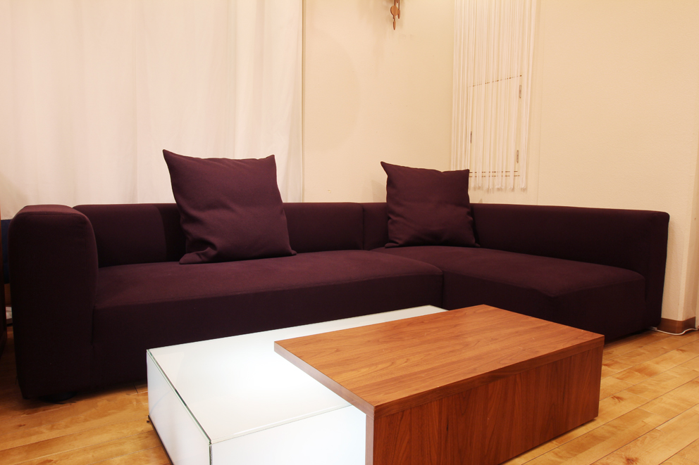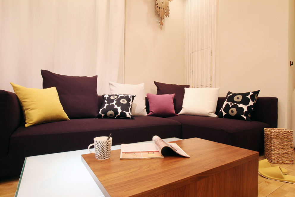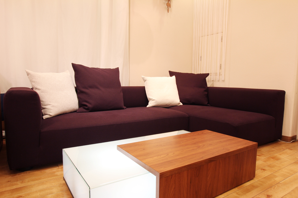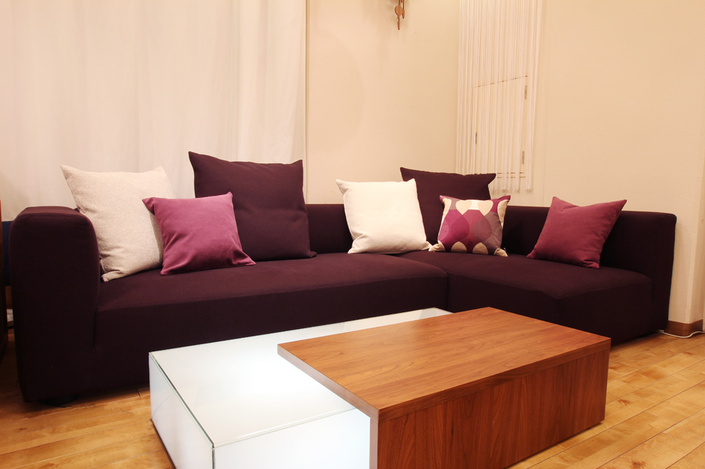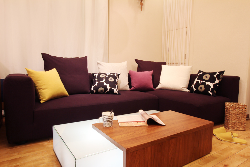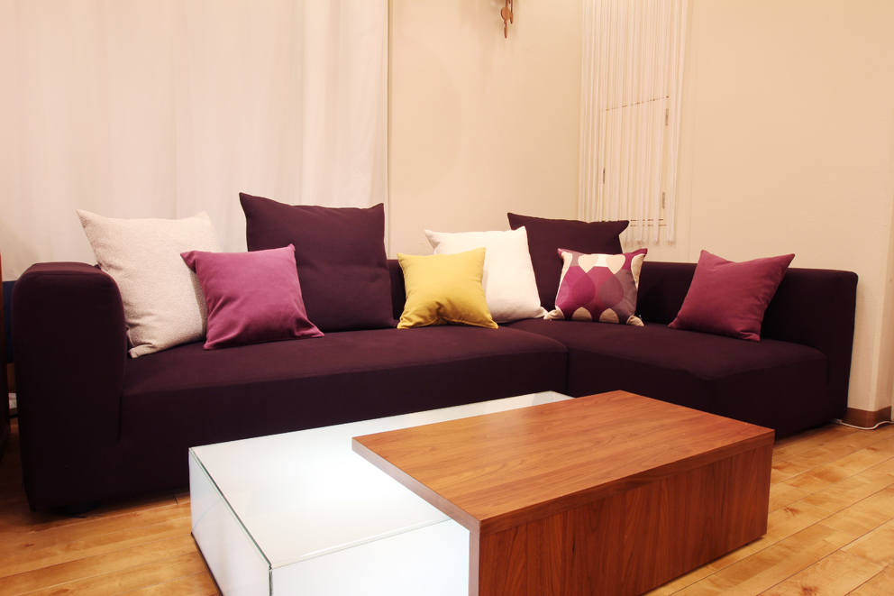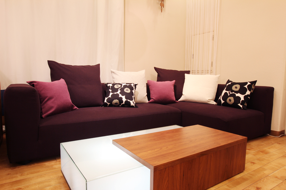 深い紫色のシンプルな形のこのソファを使ってアクセントカラーを実践してみます!