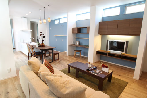 今回のお宅はリビングの壁の一面がブルーのポーターズペイントで塗られとても素敵なお部屋でした。